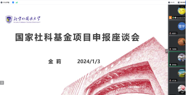 2024年1月3日上午,北京外国语大学著名教授金莉为北京外国语大学教师线下举办“国家社科基金项目申报座谈会”,座谈会由北京外国语大学科研处主办,北京外国语大学科研处处长张天伟教授主持。此前,金莉教授和北京外国语大学科研处应公司挂职副经理、北京外国语大学李期铿教授邀请,同意专门为公司教师开通腾讯会议。公司包括朱晓军经理在内的35名教师有幸通过腾讯会议,在线上同步参加金莉教授的座谈会。