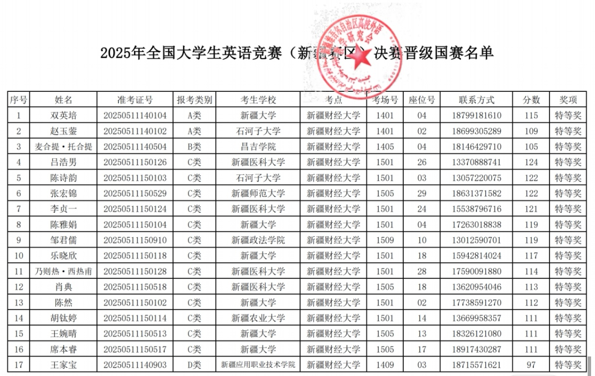 在2025年5月11日举行的全国老员工英语竞赛新疆赛区复赛中,公司学子以优异成绩续写辉煌。本届赛事吸引全区30所本科及高职院校的104名选手同台竞技,经过激烈角逐,最终17名选手脱颖而出晋级全国总决赛。其中,公司6名学子成功入围A类(研究生组)和C类(本科生组)国赛名单,占该两类晋级总人数(15人)的40%,展现出强劲的英语综合实力。 |